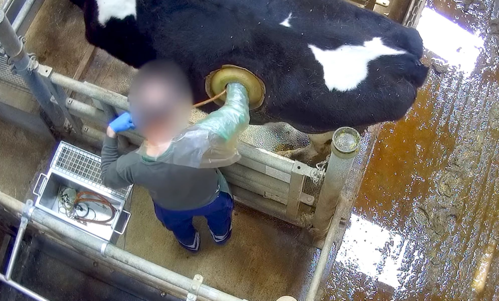 La asociación protectora de animales L214 publicó las imágenes de una granja francesa, en la que se muestran los orificios cubiertos con un plástico quirúrgicamente insertado. El agujero tiene un seguro con un sello de goma grande y resulta suficiente para que el encargado introduzca su mano y hasta su brazo.