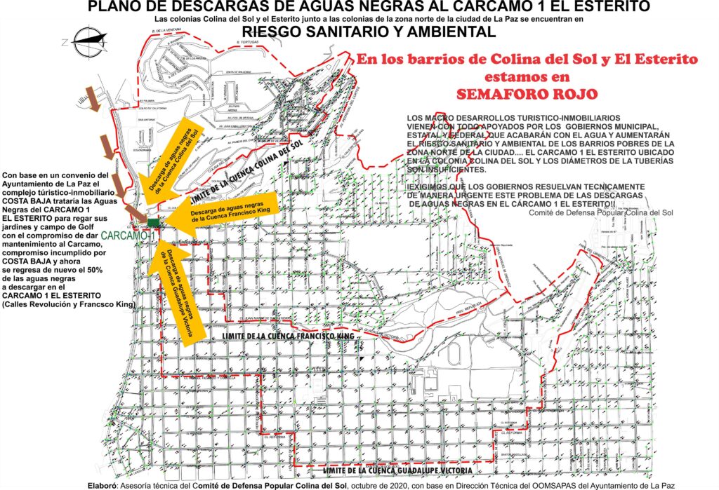 Este 5 de noviembre en audiencia pública CORAL LIZBETH DÍAZ ORANTES y MIGUEL HERNÁNDEZ RODRÍGUEZ en representación del Comité de Defensa Popular Colina del Sol, se reunieron con el Gobernador VICTOR MANUEL CASTRO COSIÓ para recordarle siendo presidente municipal de La Paz, concesionó las aguas negras del CÁRMAMO 1 EL ESTERITO a los desarrolladores del complejo turístico-inmobiliario Costa Baja (Ahora Puerto Cortés) para ser tratadas y convertidas en aguas de riego; sin embargo, al paso de los años el crecimiento de los conjuntos residenciales, el retorno de las aguas negras desde Costa Baja y la conexión de las colonias de la parte este de la ciudad, ha provocado una crisis sanitaria y ambiental en los barrios de la zona norte, especialmente en la Colonia Colina del Sol y el Barrio El Esterito.