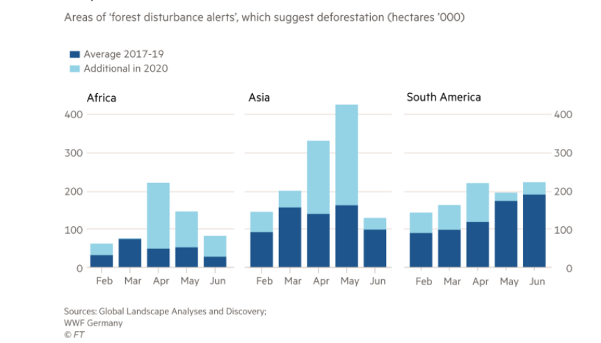 Desde el comienzo de la pandemia de coronavirus, las alertas de pérdida de bosques han aumentado en un 77% en comparación con el promedio de 2017 a 2019, según los datos del Global Land Analysis and Discovery (GLAD) -un sistema mundial de alerta para el agotamiento de la cubierta forestal- y compilados por el organismo de conservación WWF Alemania.