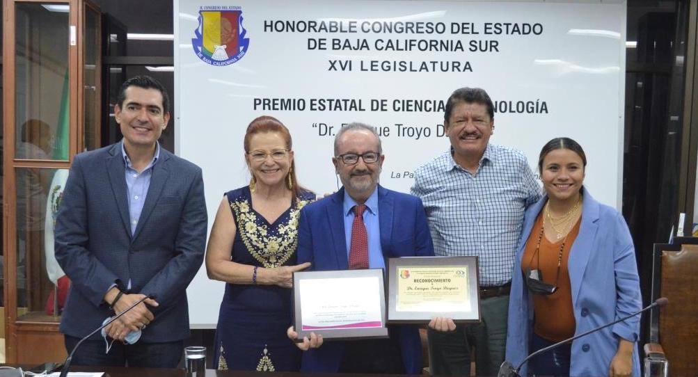 El doctor Enrique Troyo Diéguez recibió el Premio Estatal de Ciencia y Tecnología 2021 organizado por el Consejo Sudcaliforniano de Ciencia y Tecnología (COSCYT). Acompañado de los secretarios de la comisión, diputada Guadalupe Vázquez Jacinto y el diputado Rigoberto Mares Aguilar y ante la directora del COSCYT, Sara Díaz Castro y representantes del CIBNOR, CICIMAR, CICESE y universidades, el presidente Armando Martínez hizo el compromiso para reincorporar el premio estatal de ciencia y tecnología que otorgaba el congreso a representantes de la comunidad científica.