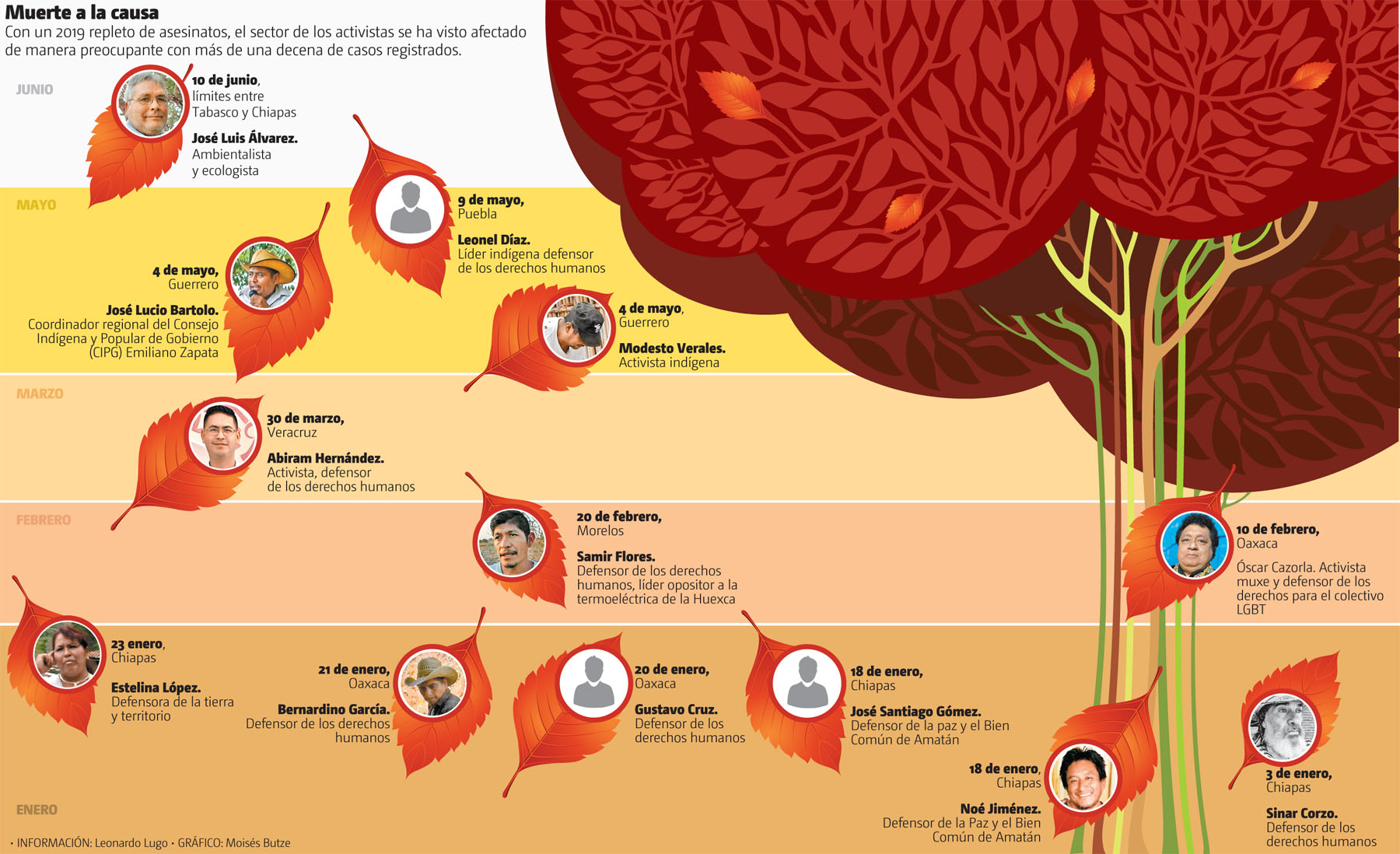 Front Line Defenders, fundación que protege a los defensores de los derechos humanos que están en riesgo, informó que en 2018 en México hubo 21 ejecutados, con lo que acaparó 15 por ciento de todos los homicidios de activistas en el mundo.