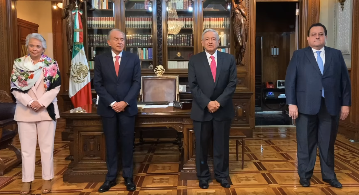 Andrés Manuel López Obrador acompañado de la titular de la Segob Olga Sánchez Cordero, se reunió en Palacio Nacional con Carlos Mendoza Davis, gobernador de Baja California Sur (BCS) y Juan Manuel Carreras López, gobernador de San Luis Potosí (SLP) para atestiguar el cambio de estafeta en la presidencia de la Conferencia Nacional de Gobernadores (Conago).