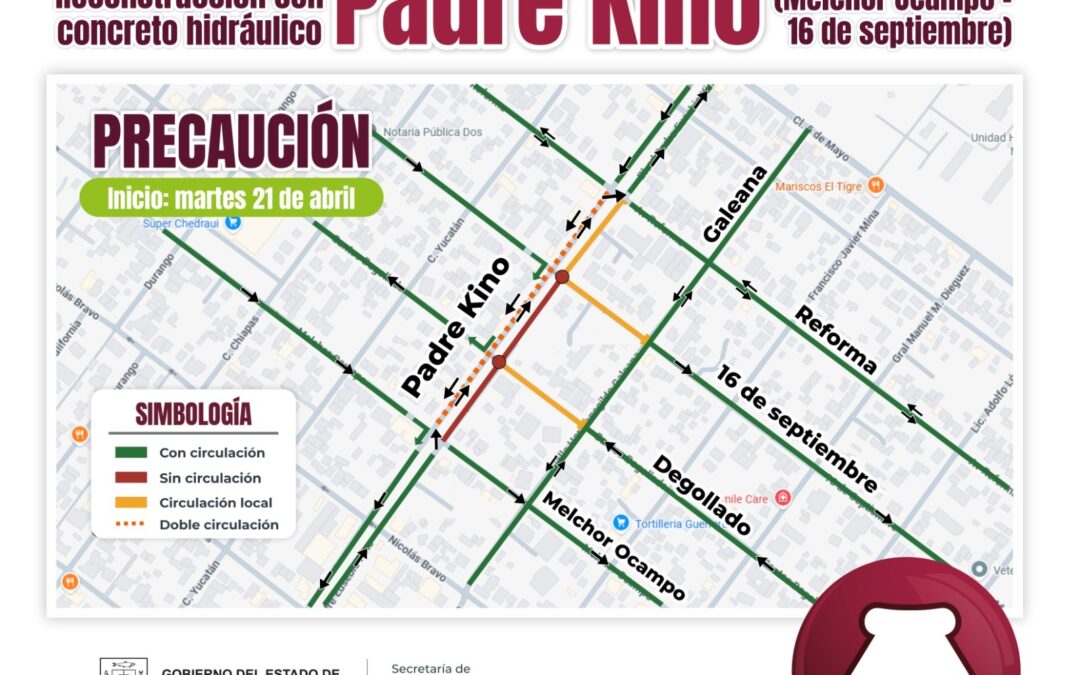 Como parte del programa de modernización de las principales vialidades de la capital, el Gobierno del Estado iniciará el próximo 21 de abril la reconstrucción con concreto hidráulico del bulevar Padre Kino, como una intervención integral que contempla tanto la superficie de rodamiento como la infraestructura subterránea, informó la Secretaría de Planeación Urbana, Infraestructura, Movilidad, Medio Ambiente y Recursos Naturales (SEPUIMM).