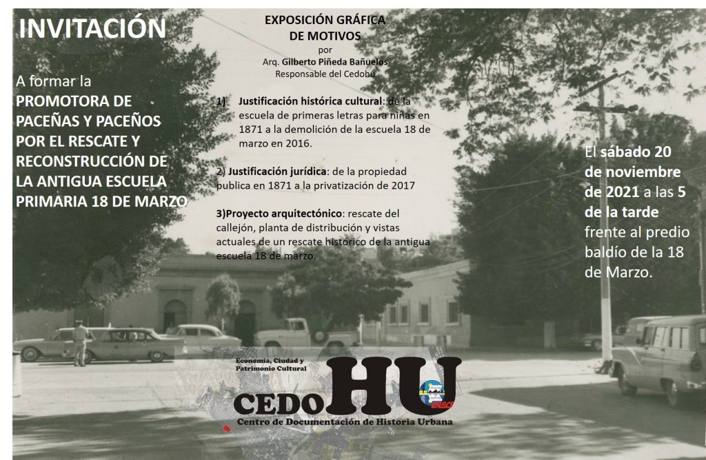 La Paz, Baja California sur. El Centro de Documentación de Historia Urbana (CEDOHU) invita a la ciudadanía en genral a participar en la conformación de la promotora de paceñas y paceños por el rescate y reconstrucción de la antigua primaria “18 de Marzo”.