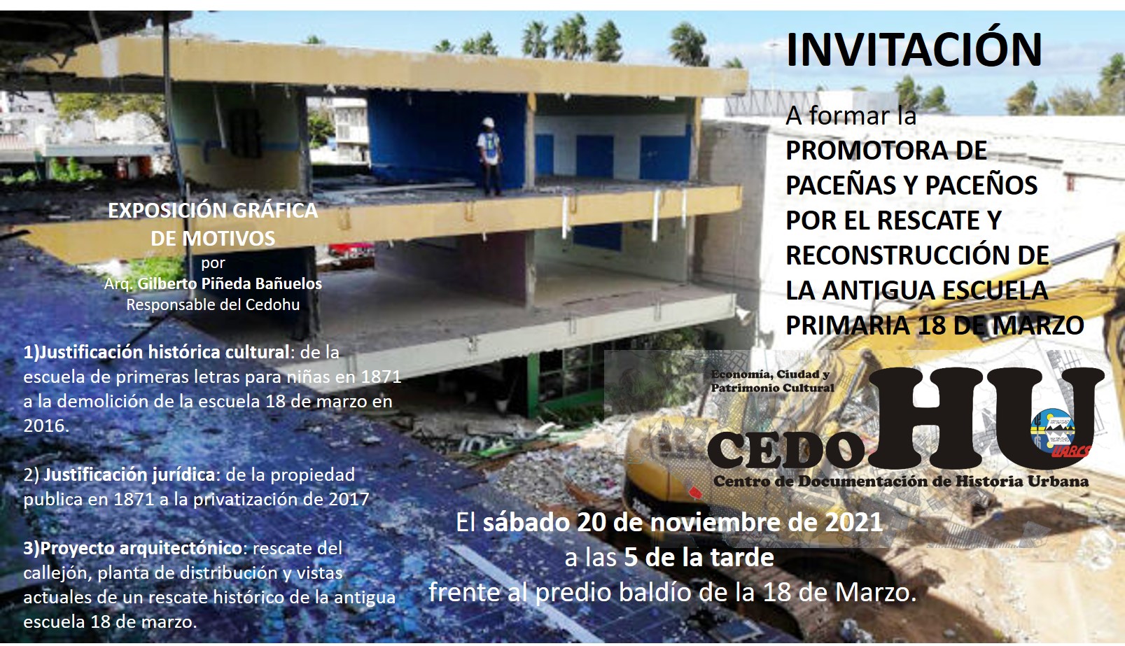 La invitación es a acudir el sábado 20 de noviembre a las 5 de la tarde en el sitio donde estaba la antigua escuela para dar a conocer la exposición de motivos por los se buscará rescatar el uso de suelo educativo y cultural, de la “18 de Marzo” y el rescate del callejón que conectaba de la 16 de Septiembre a la 5 de Mayo.