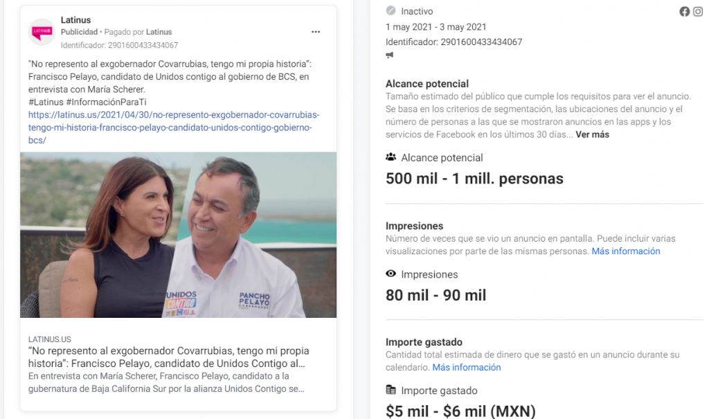 Luego que la conductora María Scherer realizó la entrevista el 21 de abril a Francisco Pelayo Covarrubias, la empresa Latinus pagó de 5 a 6 mil pesos del 1 al 3 de mayo para promover de la nota en su portal del candidato a la gubernatura del PRI-PAN-PRD y anexo. Lo que resaltó el encabezado con la que se desmarca de su tío, el exgobernador Marcos Covarrubias y quien dirigiera el estado de 2011 a 2015.