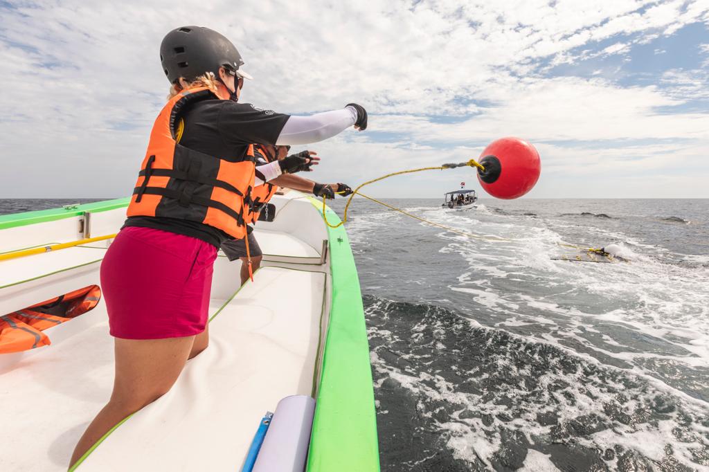 En esta ocasión participaron los catedráticos de la Carrera en Ciencias Ambientales, Carlos Montalvo y María Josué Navarro Sánchez, esta última precursora de estos trabajos en la Universidad, pues desde 2019 se ha sumado a esta iniciativa de rescate y asistencia a ballenas.
