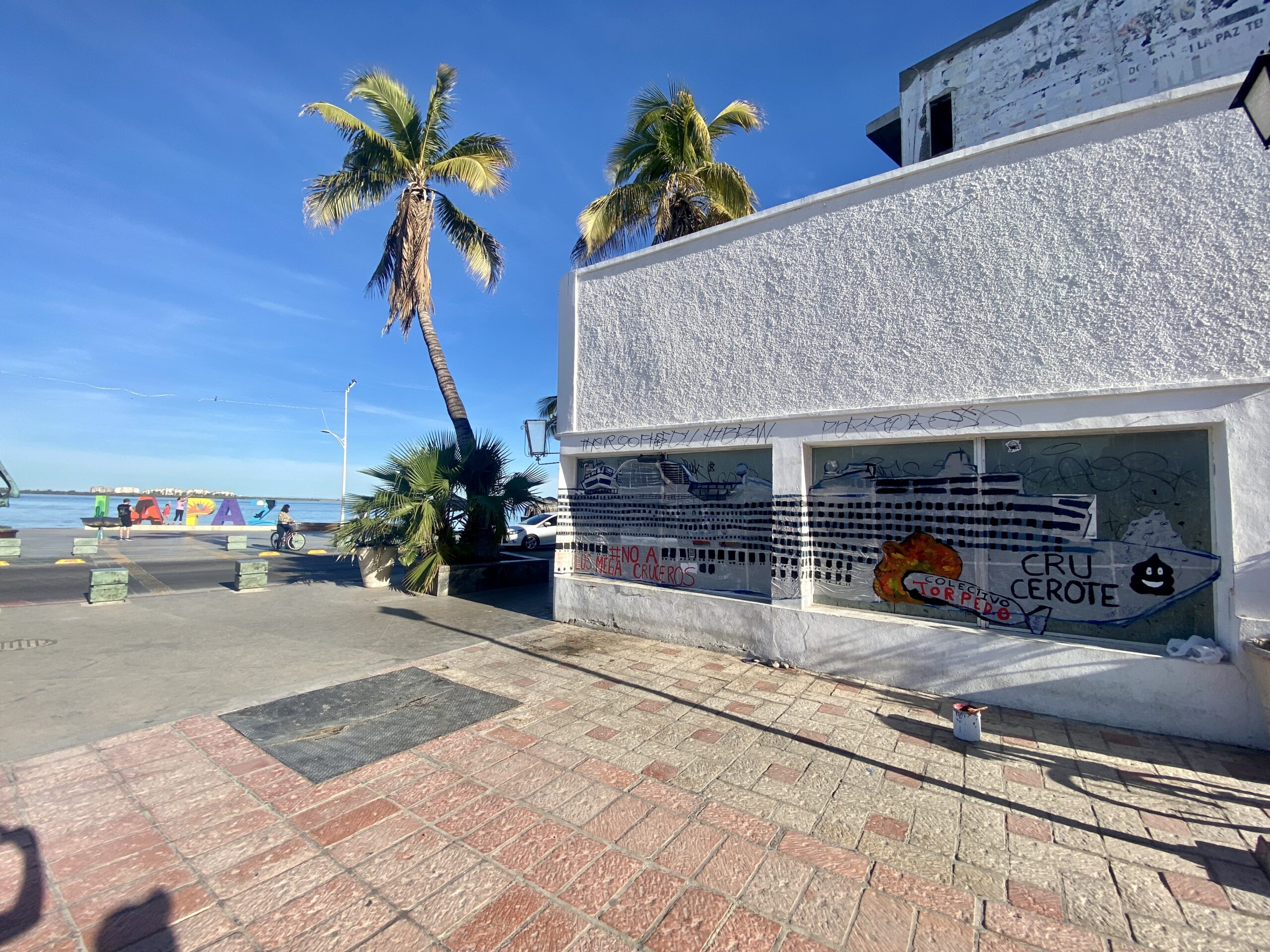 El domingo pasado, artistas locales realizaron un «crucerote», un mural alusivo a los daños sociales y ambientales, con la finalidad de informar a la gente sobre este y otros efectos negativos, de seguir con el modelo de turismo encaminado a atraer grandes flujos de turistas a la capital: “nuestra vida diaria se verá afectada por la falta de agua y luz a causa de un modelo de turismo depredador.”