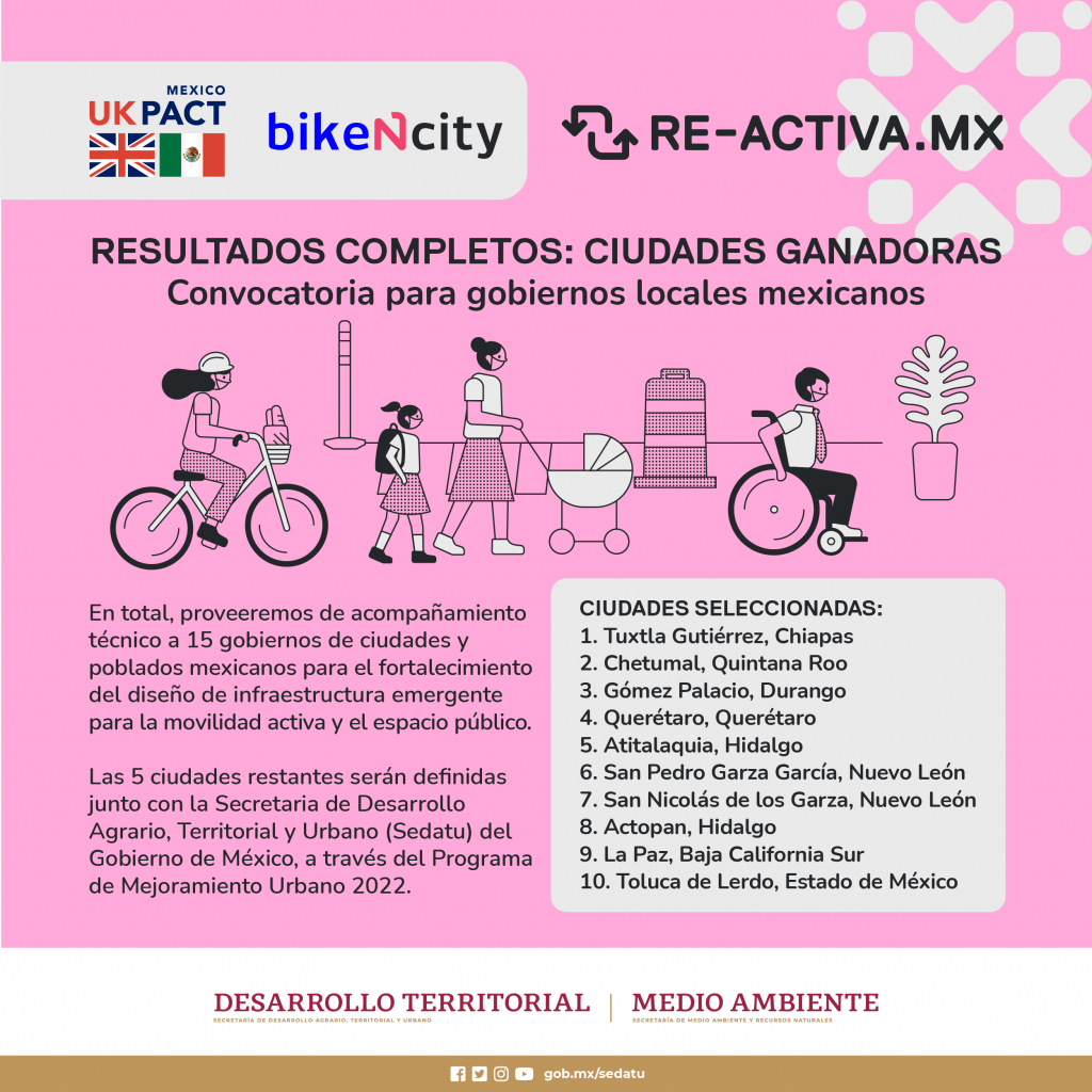RE-ACTIVA.MX es parte de UK´PACT, un proyecto implementado por bikeNcity en coordinación con el Gobierno de México, por medio de la Secretaría de Desarrollo Agrario Territorial y Urbano (SEDATU) y la Secretaría de Medio Ambiente y Recursos Naturales (SEMARNAT). UK PACT (Partnering for Accelerated Climate Transitions o Alianza para las Transiciones Climáticas Aceleradas) es un programa bilateral del Departamento de Negocios, Energía y Estrategia Industrial (BEIS, por sus siglas en inglés) del Gobierno del Reino Unido.
