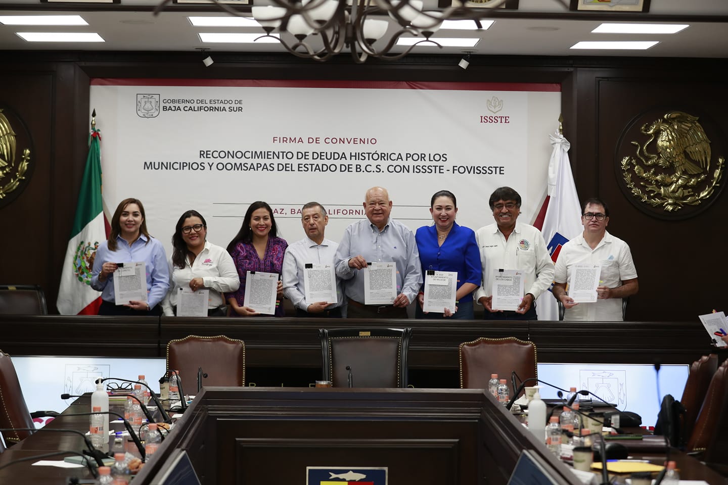 El gobernador Víctor Manuel Castro Cosío y las alcaldesas de Mulegé, Edith Aguilar Villavicencio, de Loreto, Paola Cota Davis, de Comondú, Ileana Talamantes Higuera y de La Paz, Milena Quiroga Romero, así como el alcalde de Los Cabos, Oscar Leggs Castro, firmaron con el director general del Instituto de Seguridad y Servicios Sociales para los Trabajadores del Estado (ISSSTE), Pedro Zenteno Santaella un convenio de reconocimiento de la deuda histórica con esta institución y con Fovissste, que en total asciende a casi 3 mil millones de pesos.