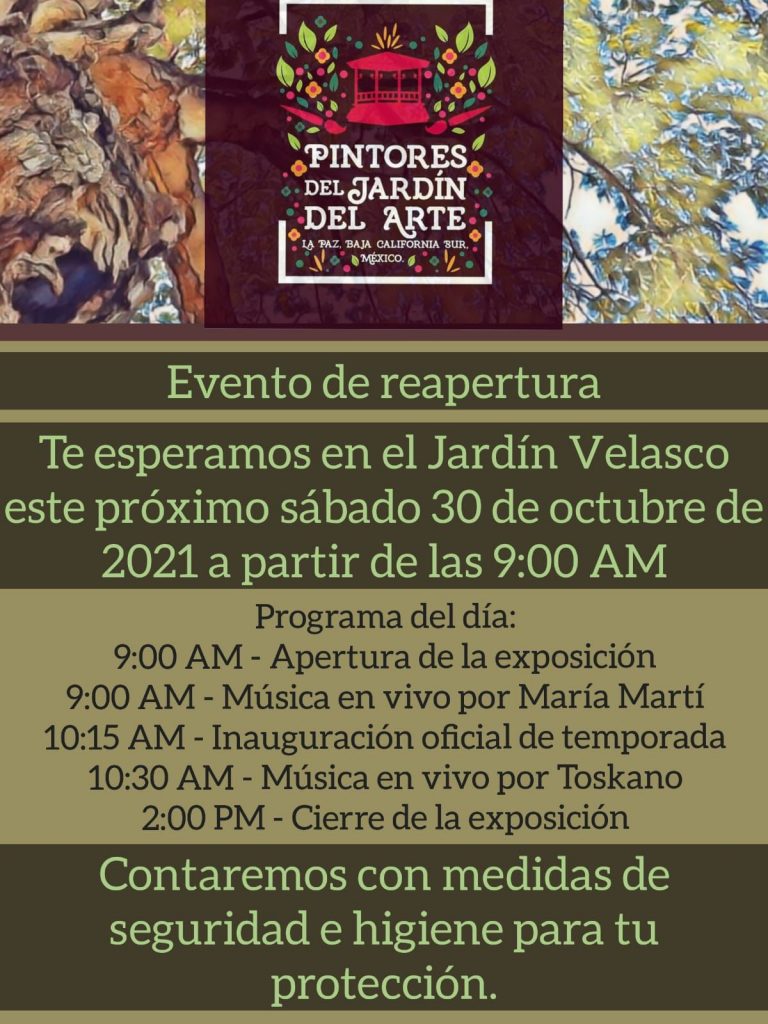 A partir del 30 de octubre, con la aplicación de medidas sanitarias y desde las 9:30 de la mañana un colectivo de artistas de los «Pintores del Jardín del Arte«se reunirán de nuevo en esta actividad para promover la plástica local que ya era tradicional en el Jardín Velasco de la zona dorada del puerto de ilusión.