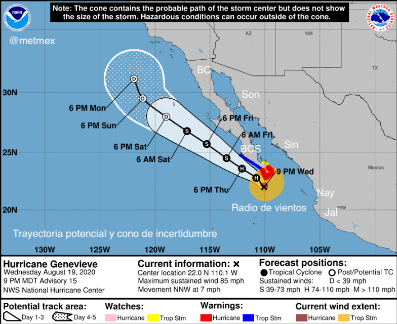 – Entre las 23:00 horas y las 02:00 horas (tiempo local) serán los momentos más difíciles ya que Genevieve podrá acercarse más o incluso tocar tierra justo al Oeste de Cabo San Lucas en el horario arriba mencionado.
