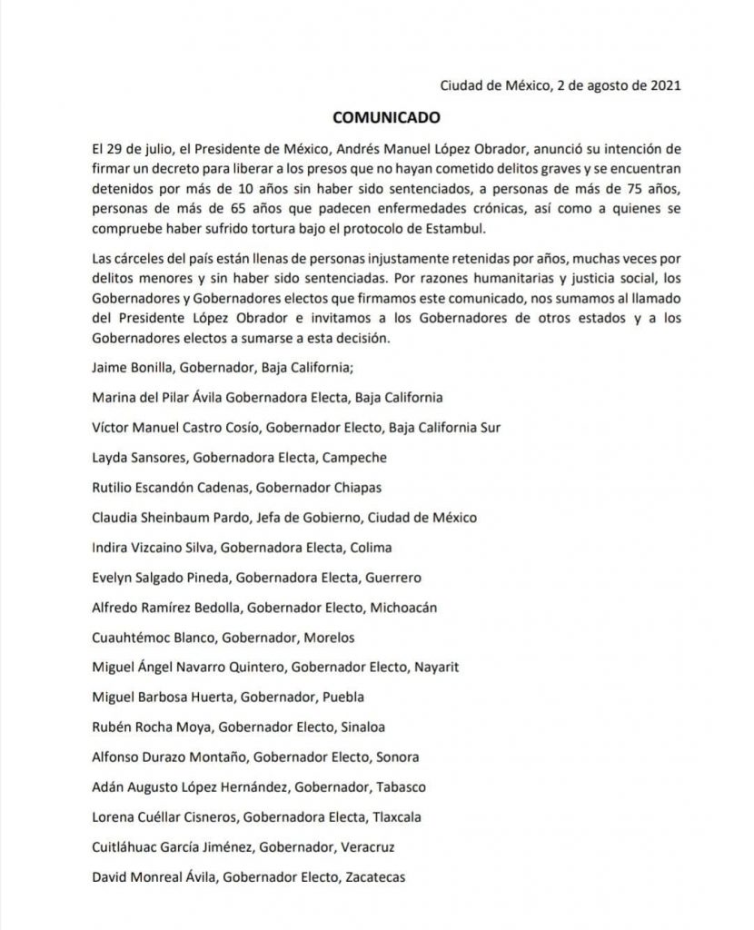 “Amigas y amigos, en un acto de humanismo y de justicia, junto a gobernadoras y gobernadores electos y en funciones, me sumo a la iniciativa del presidente de la república, Andrés Manuel López Obrador, para que sea otorgada la libertad a presos que no hayan cometido delitos graves, que tengan más de 75 años de edad o más de 65 años y padezcan de enfermedades crónicas, aquellos que fueron torturados, y quienes lleven más de 10 años encarcelados sin sentencia. Les comparto el comunicado:”